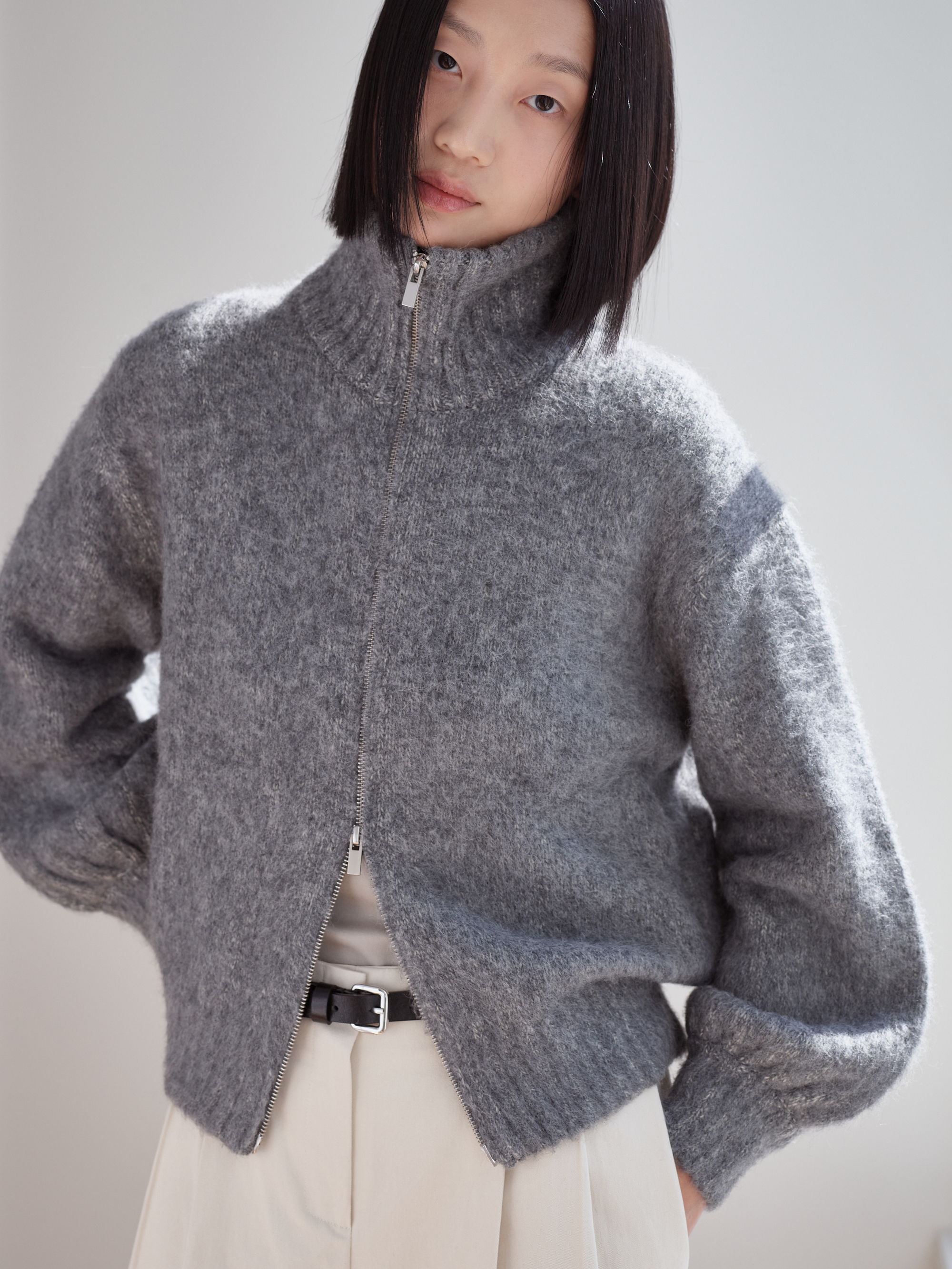 베이비알파카 집업가디건_멜란그레이