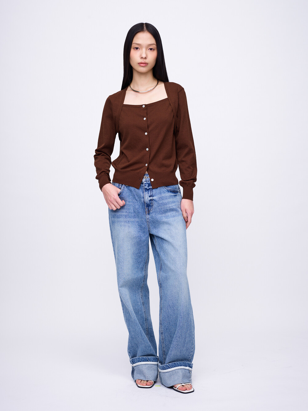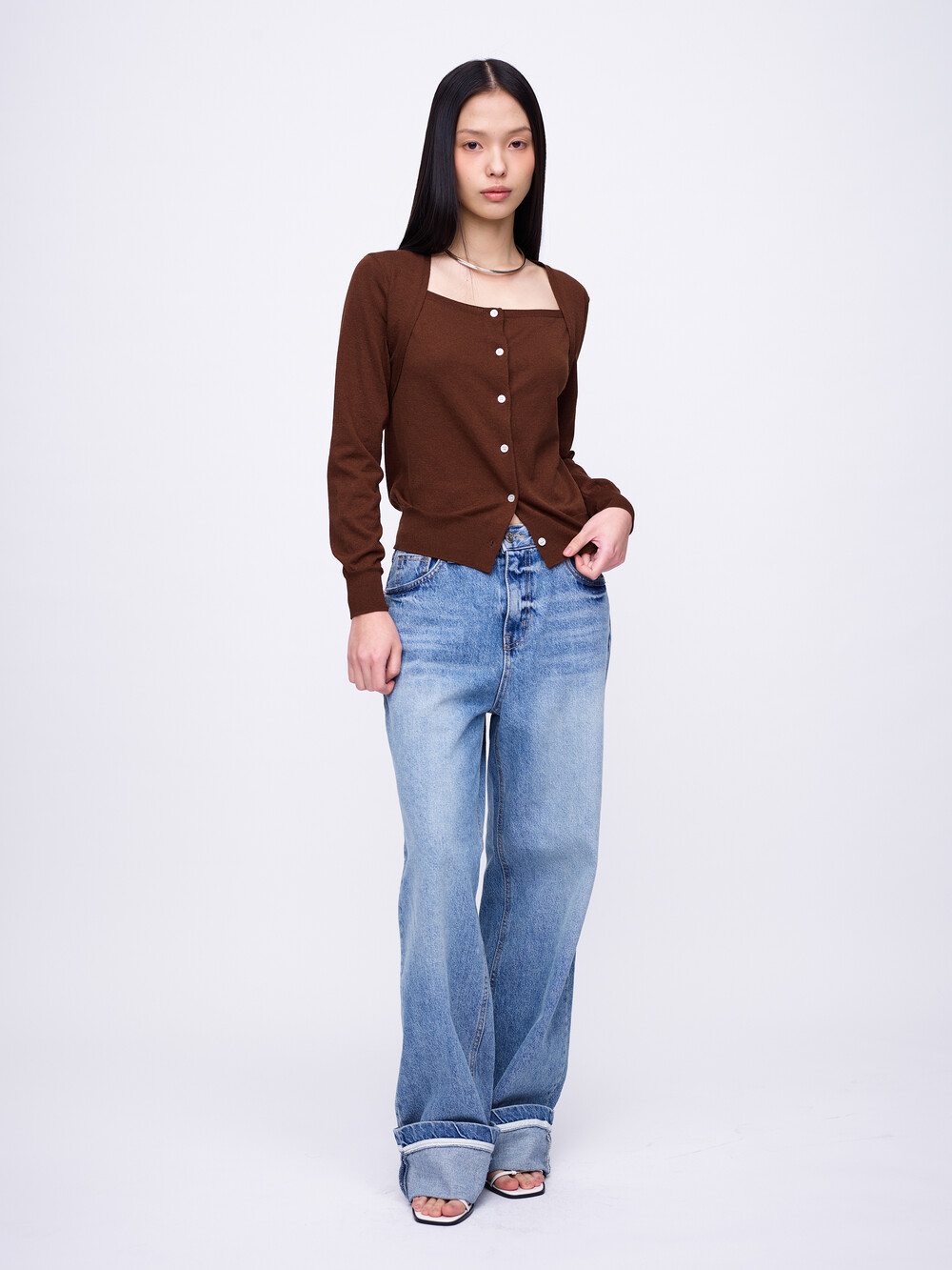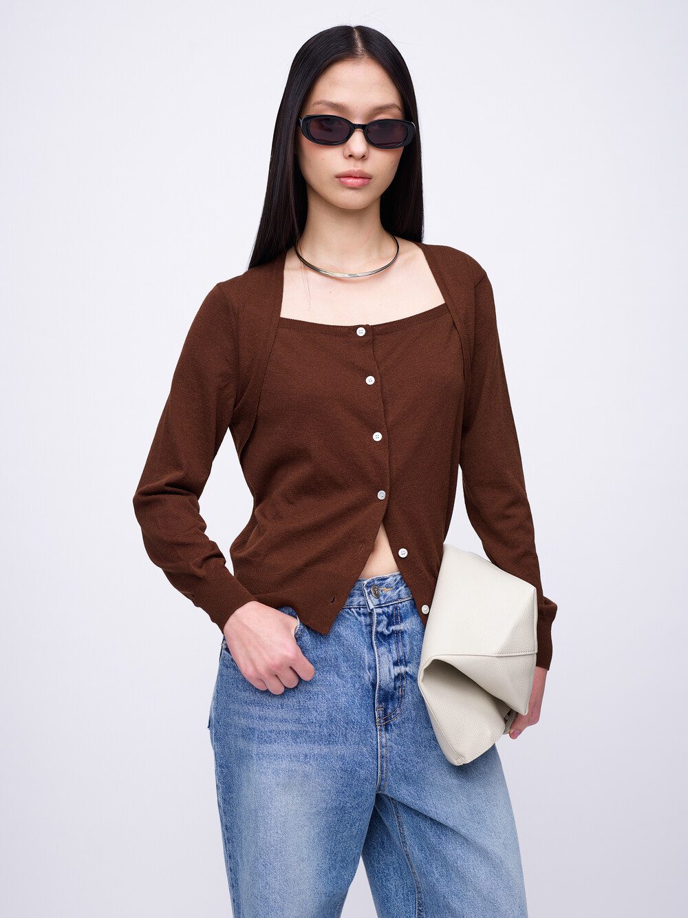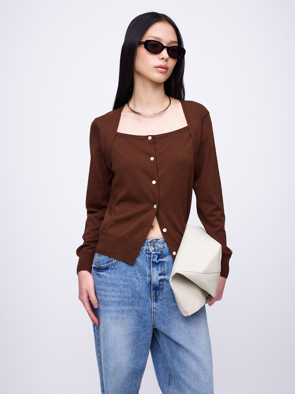 Square-Neck Bolero Cardigan_Brown