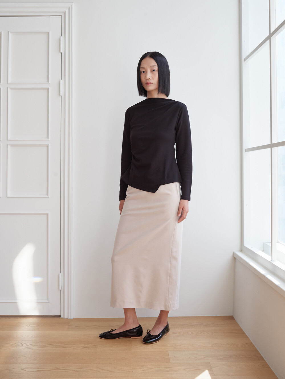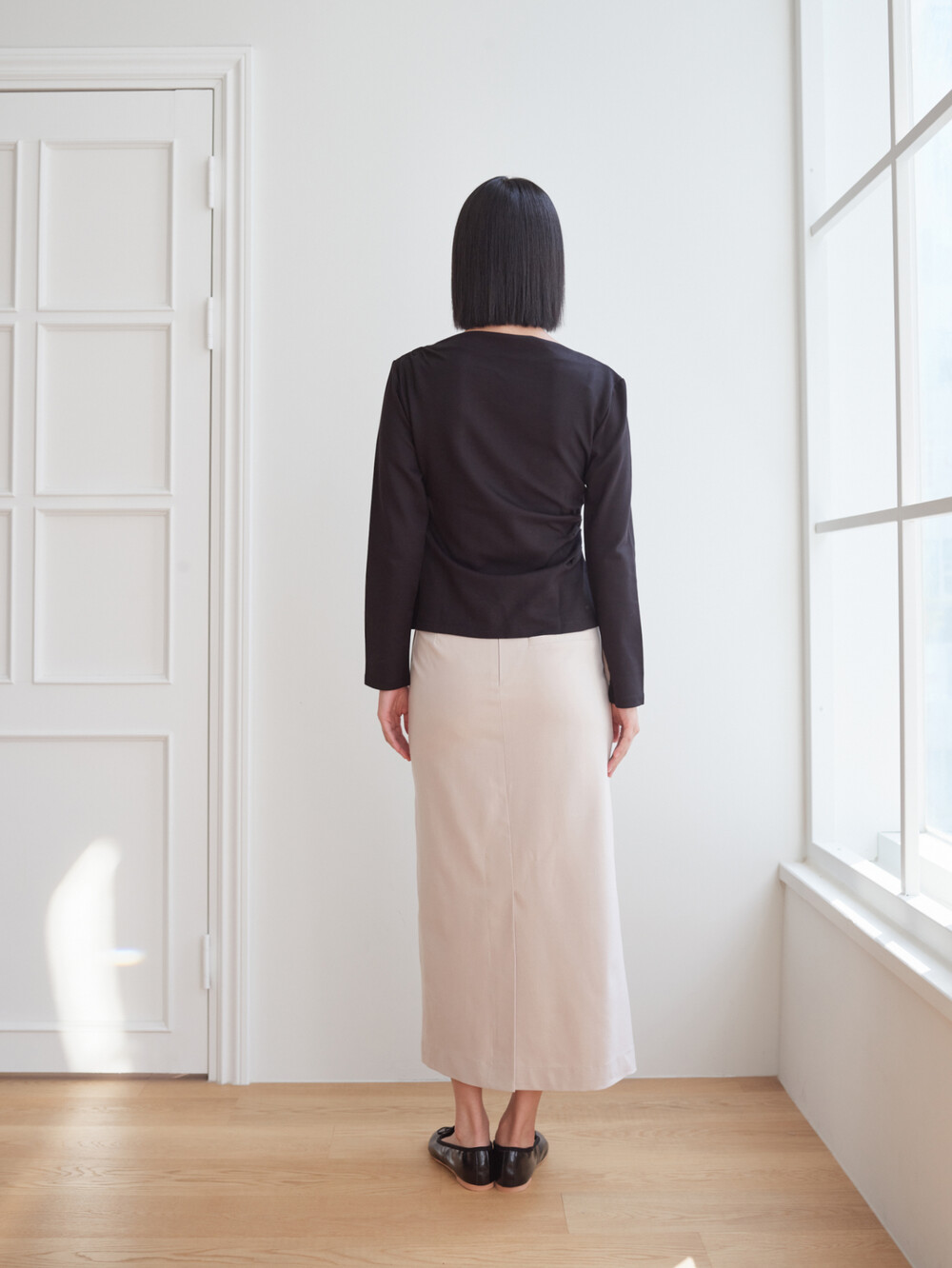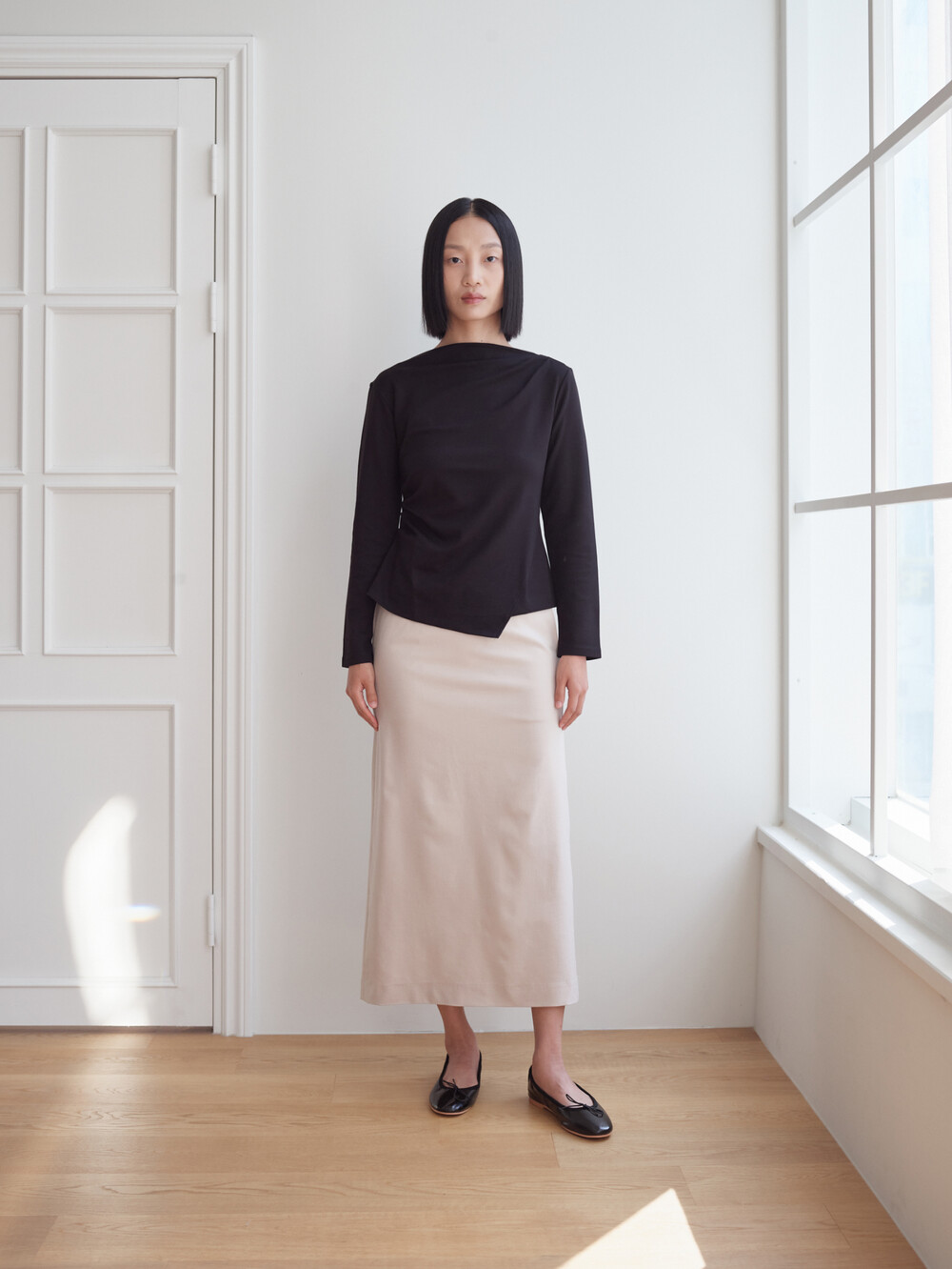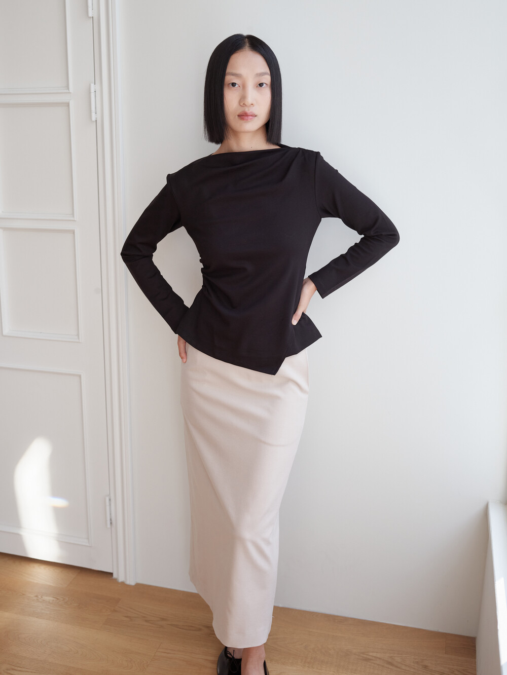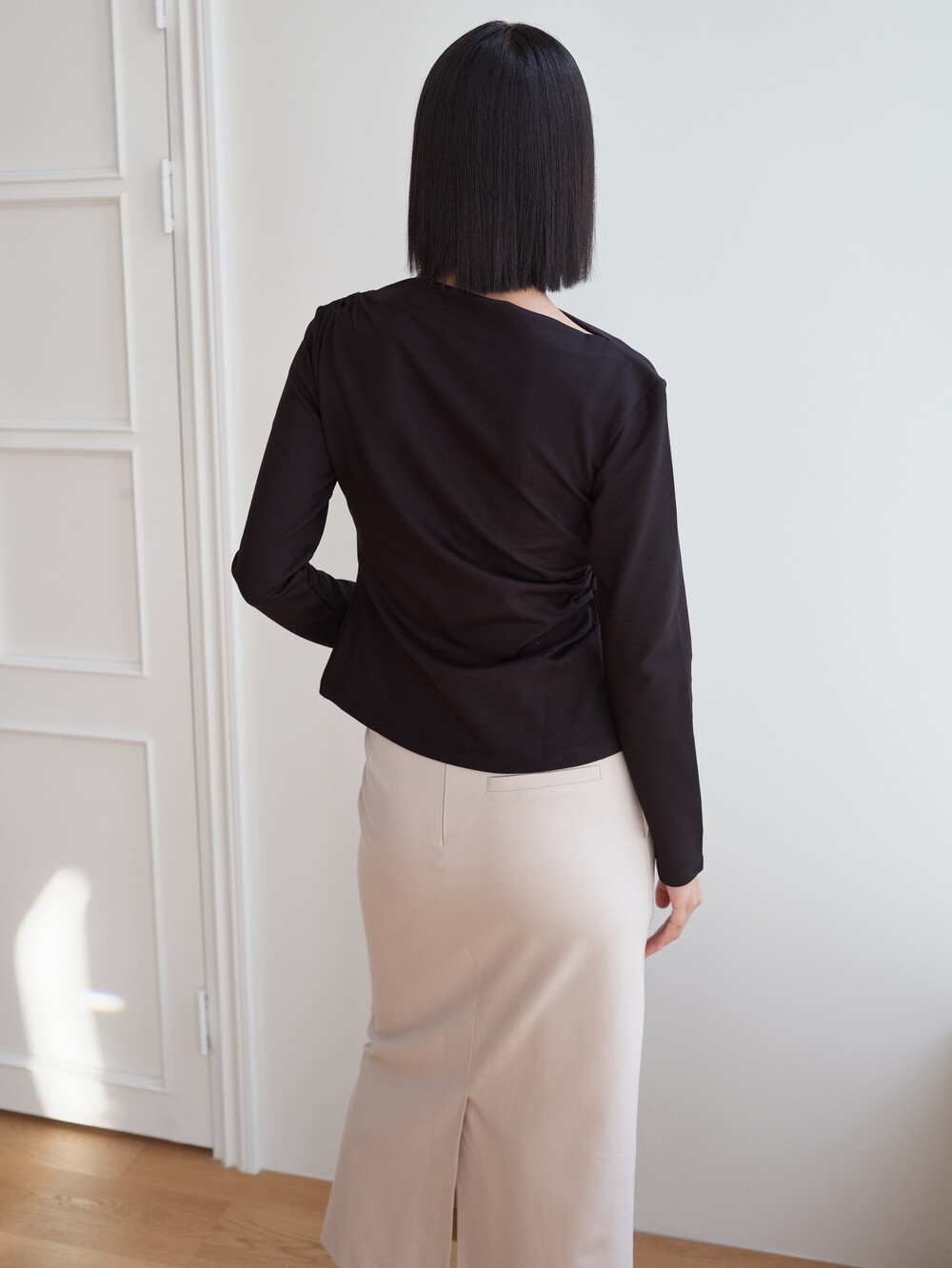 보트넥 셔링 긴팔 티셔츠_블랙