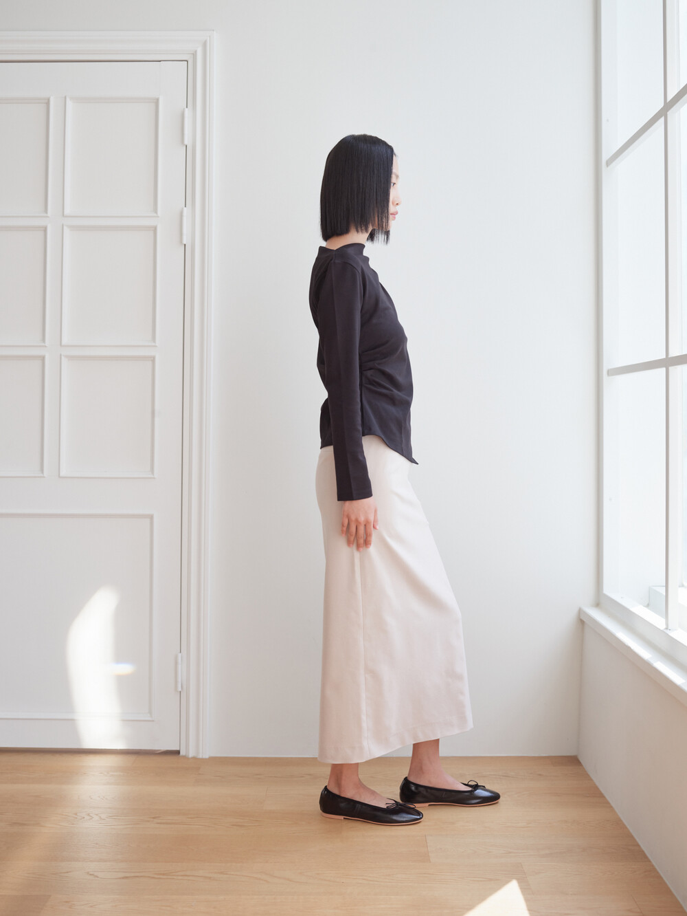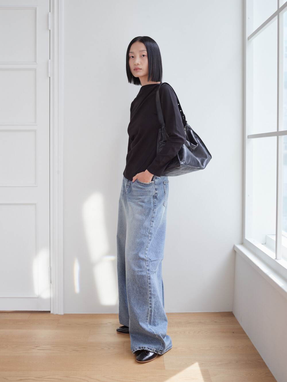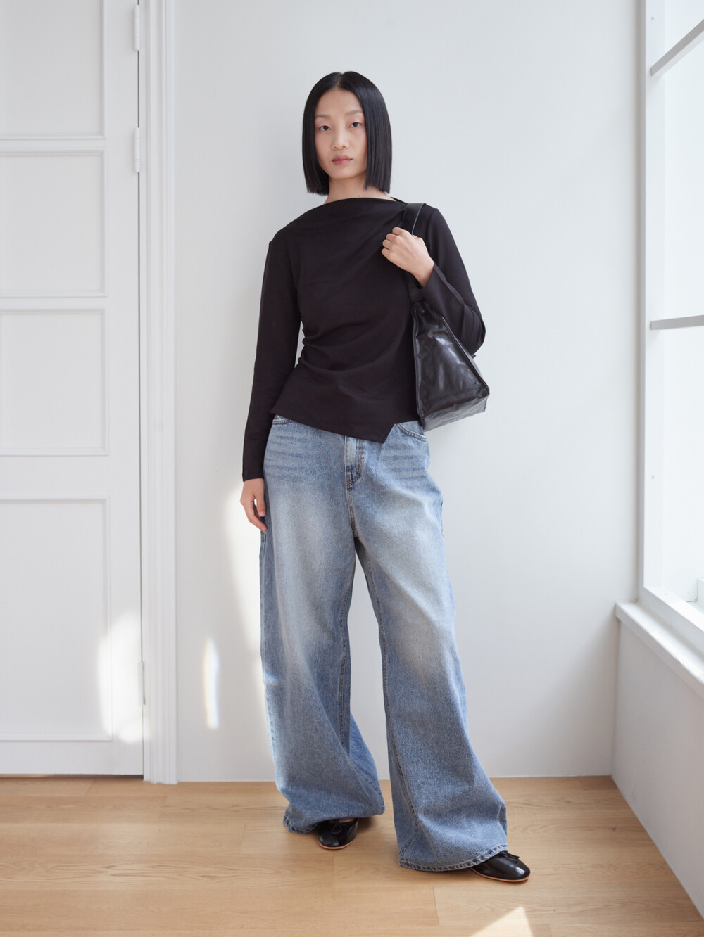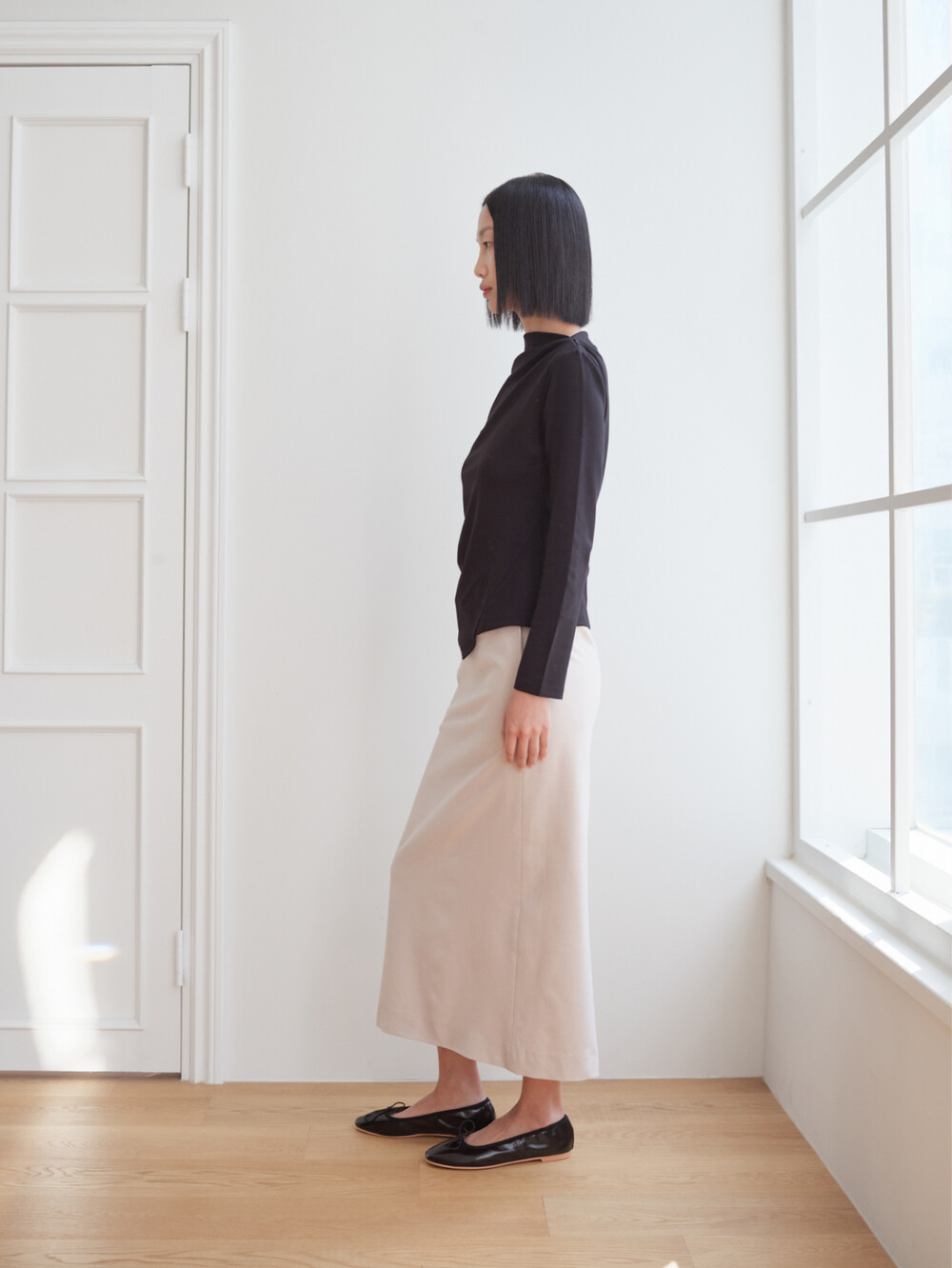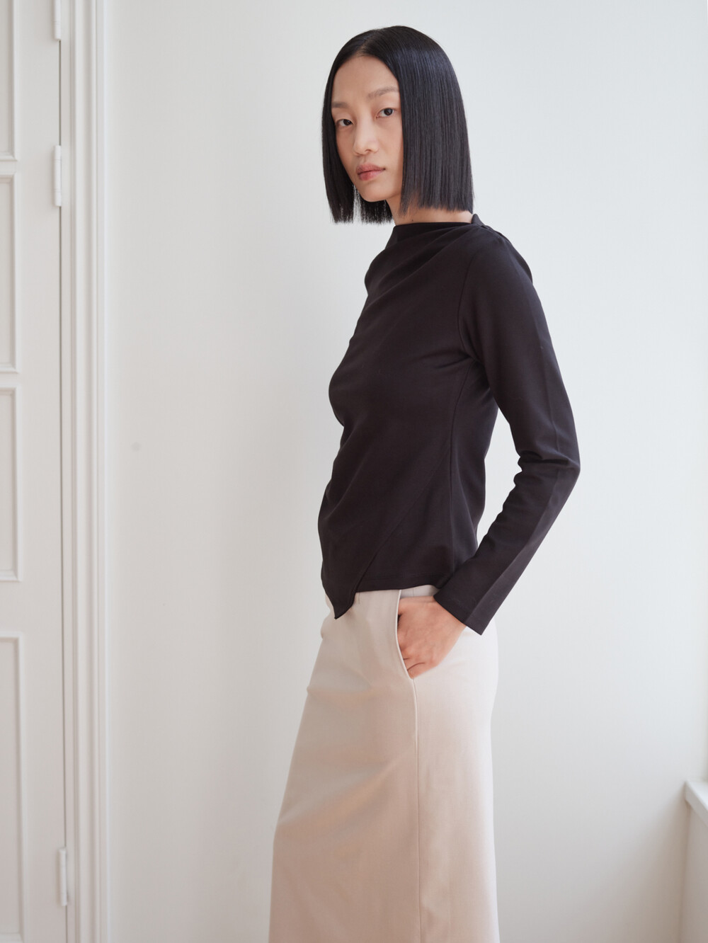 보트넥 셔링 긴팔 티셔츠_블랙